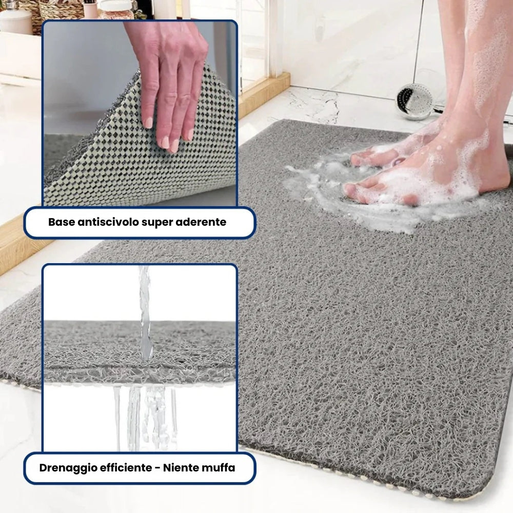 La base aderente mantiene il tappetino fermo anche su pavimenti bagnati e il drenaggio rapido evita accumuli d’acqua, riducendo il rischio di scivolate.